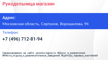 Рукодельница, магазин по адресу Московская область, Серпухов, Ворошилова, 94 в дальнейшем Организация, размещена в следующих категориях: