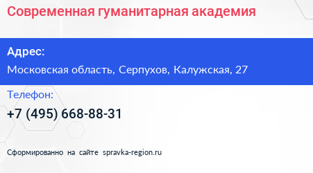 Современная гуманитарная академия по адресу Московская область, Серпухов, Калужская, 27 в дальнейшем Организация, размещена в следующих категориях: