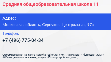 Средняя общеобразовательная школа №11 по адресу Московская область, Серпухов, Центральная, 97а в дальнейшем Организация, размещена в следующих категориях: