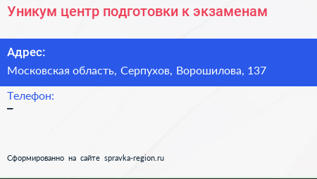 Уникум, центр подготовки к экзаменам по адресу Московская область, Серпухов, Ворошилова, 137 в дальнейшем Организация, размещена в следующих категориях: