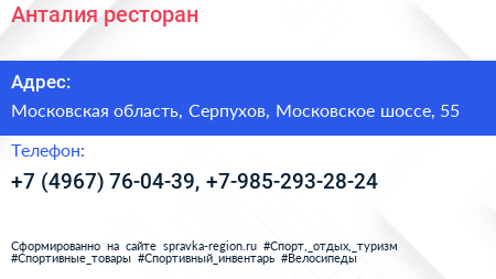 Анталия, ресторан по адресу Московская область, Серпухов, Московское шоссе, 55 в дальнейшем Организация, размещена в следующих категориях: