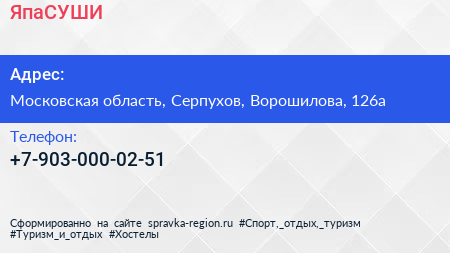 ЯпаСУШИ по адресу Московская область, Серпухов, Ворошилова, 126а в дальнейшем Организация, размещена в следующих категориях: