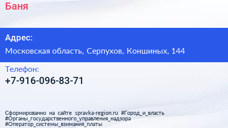 Баня по адресу Московская область, Серпухов, Коншиных, 144 в дальнейшем Организация, размещена в следующих категориях: