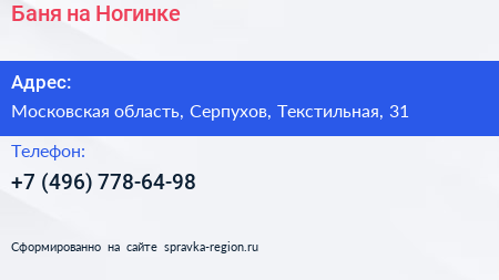 Баня на Ногинке по адресу Московская область, Серпухов, Текстильная, 31 в дальнейшем Организация, размещена в следующих категориях: