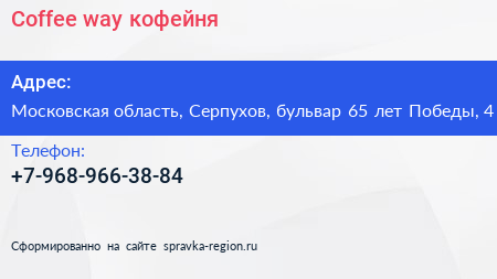 Coffee way, кофейня по адресу Московская область, Серпухов, бульвар 65 лет Победы, 4 в дальнейшем Организация, размещена в следующих категориях: