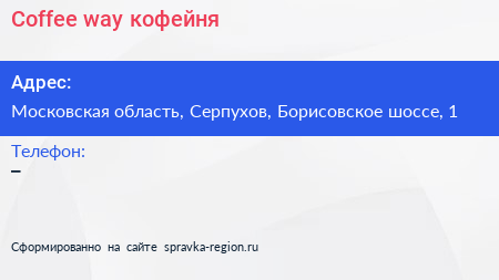 Coffee way, кофейня по адресу Московская область, Серпухов, Борисовское шоссе, 1 в дальнейшем Организация, размещена в следующих категориях: