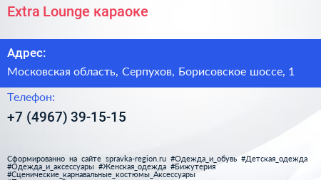 Extra Lounge, караоке по адресу Московская область, Серпухов, Борисовское шоссе, 1 в дальнейшем Организация, размещена в следующих категориях: