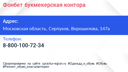 Фонбет, букмекерская контора по адресу Московская область, Серпухов, Ворошилова, 147а в дальнейшем Организация, размещена в следующих категориях: