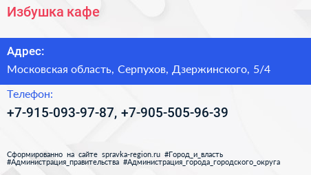 Избушка, кафе по адресу Московская область, Серпухов, Дзержинского, 5/4 в дальнейшем Организация, размещена в следующих категориях: