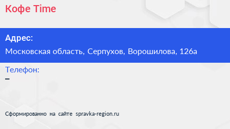 Кофе Time по адресу Московская область, Серпухов, Ворошилова, 126а в дальнейшем Организация, размещена в следующих категориях: