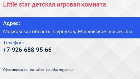Little star, детская игровая комната по адресу Московская область, Серпухов, Московское шоссе, 55а в дальнейшем Организация, размещена в следующих категориях: