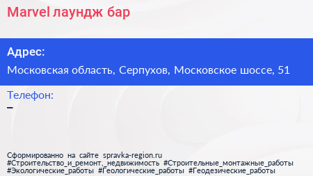Marvel, лаундж-бар по адресу Московская область, Серпухов, Московское шоссе, 51 в дальнейшем Организация, размещена в следующих категориях:
