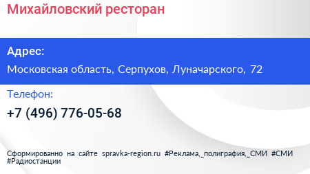 Михайловский, ресторан по адресу Московская область, Серпухов, Луначарского, 72 в дальнейшем Организация, размещена в следующих категориях:
