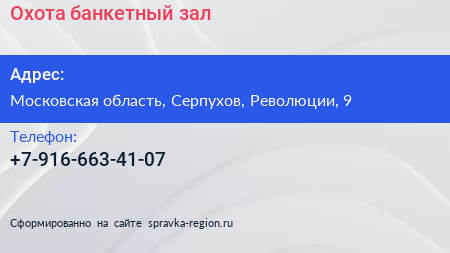 Охота, банкетный зал по адресу Московская область, Серпухов, Революции, 9 в дальнейшем Организация, размещена в следующих категориях: