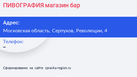 ПИВОГРАФИЯ, магазин-бар по адресу Московская область, Серпухов, Революции, 4 в дальнейшем Организация, размещена в следующих категориях: