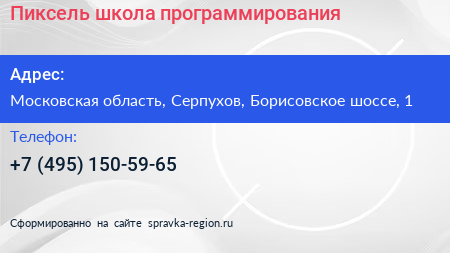 Пиксель, школа программирования по адресу Московская область, Серпухов, Борисовское шоссе, 1 в дальнейшем Организация, размещена в следующих категориях: