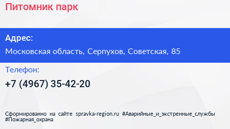 Питомник, парк по адресу Московская область, Серпухов, Советская, 85 в дальнейшем Организация, размещена в следующих категориях: