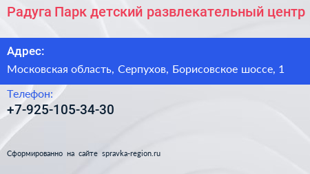 Радуга Парк, детский развлекательный центр по адресу Московская область, Серпухов, Борисовское шоссе, 1 в дальнейшем Организация, размещена в следующих категориях: