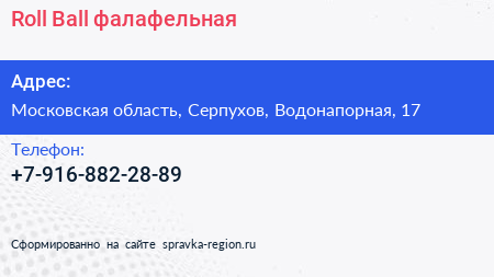 Roll & Ball, фалафельная по адресу Московская область, Серпухов, Водонапорная, 17 в дальнейшем Организация, размещена в следующих категориях: