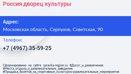 Россия, дворец культуры по адресу Московская область, Серпухов, Советская, 90 в дальнейшем Организация, размещена в следующих категориях: