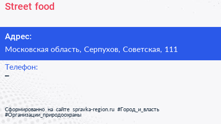Street food по адресу Московская область, Серпухов, Советская, 111 в дальнейшем Организация, размещена в следующих категориях: