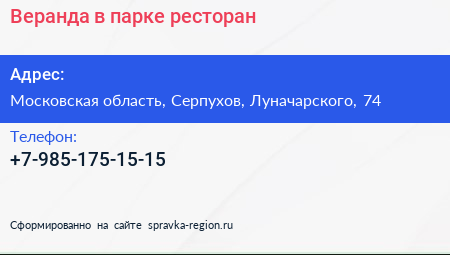 Веранда в парке, ресторан по адресу Московская область, Серпухов, Луначарского, 74 в дальнейшем Организация, размещена в следующих категориях: