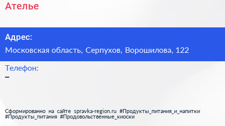 Ателье по адресу Московская область, Серпухов, Ворошилова, 122 в дальнейшем Организация, размещена в следующих категориях: