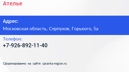 Ателье по адресу Московская область, Серпухов, Горького, 5а в дальнейшем Организация, размещена в следующих категориях:
