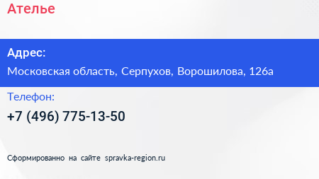 Ателье по адресу Московская область, Серпухов, Ворошилова, 126а в дальнейшем Организация, размещена в следующих категориях:
