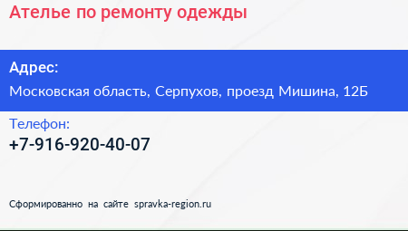 Ателье по ремонту одежды по адресу Московская область, Серпухов, проезд Мишина, 12Б в дальнейшем Организация, размещена в следующих категориях: