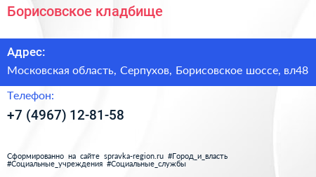 Борисовское кладбище по адресу Московская область, Серпухов, Борисовское шоссе, вл48 в дальнейшем Организация, размещена в следующих категориях:
