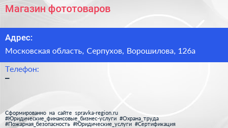 Магазин фототоваров по адресу Московская область, Серпухов, Ворошилова, 126а в дальнейшем Организация, размещена в следующих категориях: