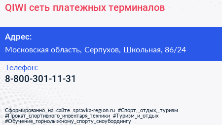 QIWI, сеть платежных терминалов по адресу Московская область, Серпухов, Школьная, 86/24 в дальнейшем Организация, размещена в следующих категориях: