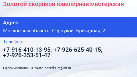 Золотой скорпион, ювелирная мастерская по адресу Московская область, Серпухов, Бригадная, 2 в дальнейшем Организация, размещена в следующих категориях: