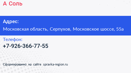 А-Соль по адресу Московская область, Серпухов, Московское шоссе, 55а в дальнейшем Организация, размещена в следующих категориях: