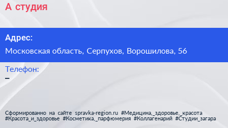 А-студия по адресу Московская область, Серпухов, Ворошилова, 56 в дальнейшем Организация, размещена в следующих категориях:
