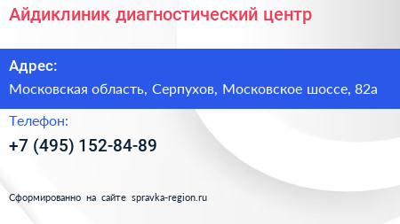 Айдиклиник, диагностический центр по адресу Московская область, Серпухов, Московское шоссе, 82а в дальнейшем Организация, размещена в следующих категориях: