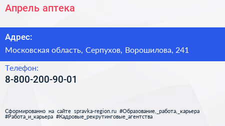 Апрель, аптека по адресу Московская область, Серпухов, Ворошилова, 241 в дальнейшем Организация, размещена в следующих категориях: