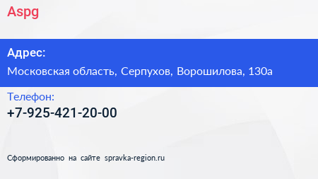 Aspg по адресу Московская область, Серпухов, Ворошилова, 130а в дальнейшем Организация, размещена в следующих категориях: