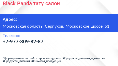 Black Panda, тату-салон по адресу Московская область, Серпухов, Московское шоссе, 51 в дальнейшем Организация, размещена в следующих категориях: