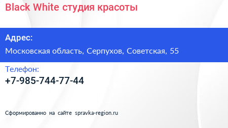 Black & White, студия красоты по адресу Московская область, Серпухов, Советская, 55 в дальнейшем Организация, размещена в следующих категориях: