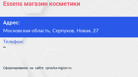 Essens, магазин косметики по адресу Московская область, Серпухов, Новая, 27 в дальнейшем Организация, размещена в следующих категориях: