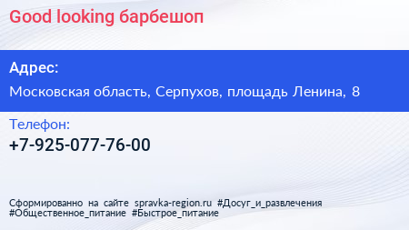 Good looking, барбешоп по адресу Московская область, Серпухов, площадь Ленина, 8 в дальнейшем Организация, размещена в следующих категориях: