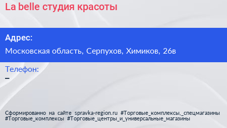 La belle, студия красоты по адресу Московская область, Серпухов, Химиков, 26в в дальнейшем Организация, размещена в следующих категориях: