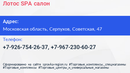 Лотос, SPA-салон по адресу Московская область, Серпухов, Советская, 47 в дальнейшем Организация, размещена в следующих категориях: