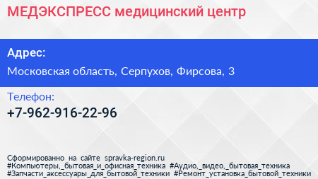 МЕДЭКСПРЕСС, медицинский центр по адресу Московская область, Серпухов, Фирсова, 3 в дальнейшем Организация, размещена в следующих категориях: