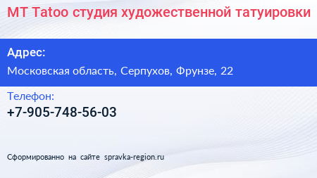 MT Tatoo, студия художественной татуировки по адресу Московская область, Серпухов, Фрунзе, 22 в дальнейшем Организация, размещена в следующих категориях: