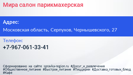 Мира, салон-парикмахерская по адресу Московская область, Серпухов, Чернышевского, 27 в дальнейшем Организация, размещена в следующих категориях: