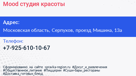 Mood, студия красоты по адресу Московская область, Серпухов, проезд Мишина, 13а в дальнейшем Организация, размещена в следующих категориях: