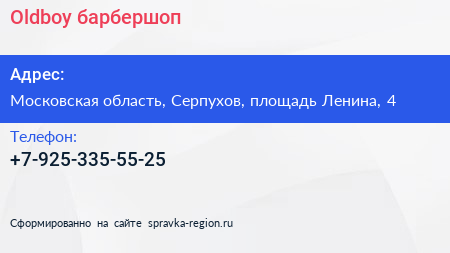 Oldboy, барбершоп по адресу Московская область, Серпухов, площадь Ленина, 4 в дальнейшем Организация, размещена в следующих категориях: